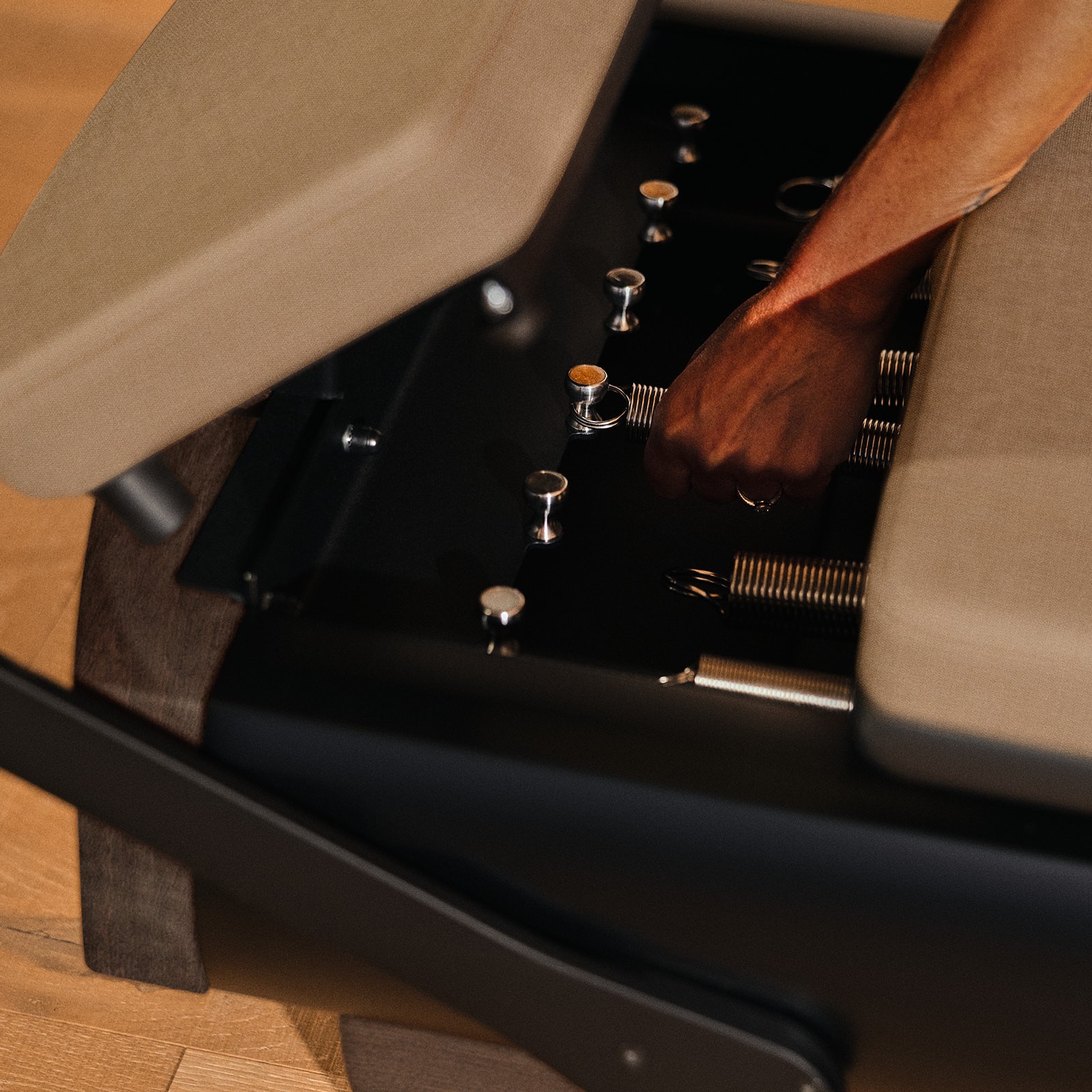 Coreformer, in partnership with NOHRD, uses the highest quality materials with an eye towards performance, durability, tactility, and natural beauty. Each piece of wood, upholstery, and frame is evaluated and handpicked to support long-term use while delighting the senses. The Coreformer is manufactured by hand by NOHRD’s experienced craftspeople, combining machine precision with the human touch to create a high-quality, enduring reformer that looks and feels exceptional.